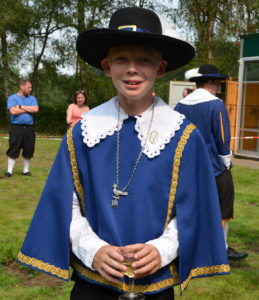 De koning draagt het koningszilver met het kostbare patroonsteken en de zilveren vogel en de koningsschilden. De nieuwe koning dient de zilverschat te verzwaren met een nieuw koningsschild. Op de foto onze huidige koning; Ad Aarts.