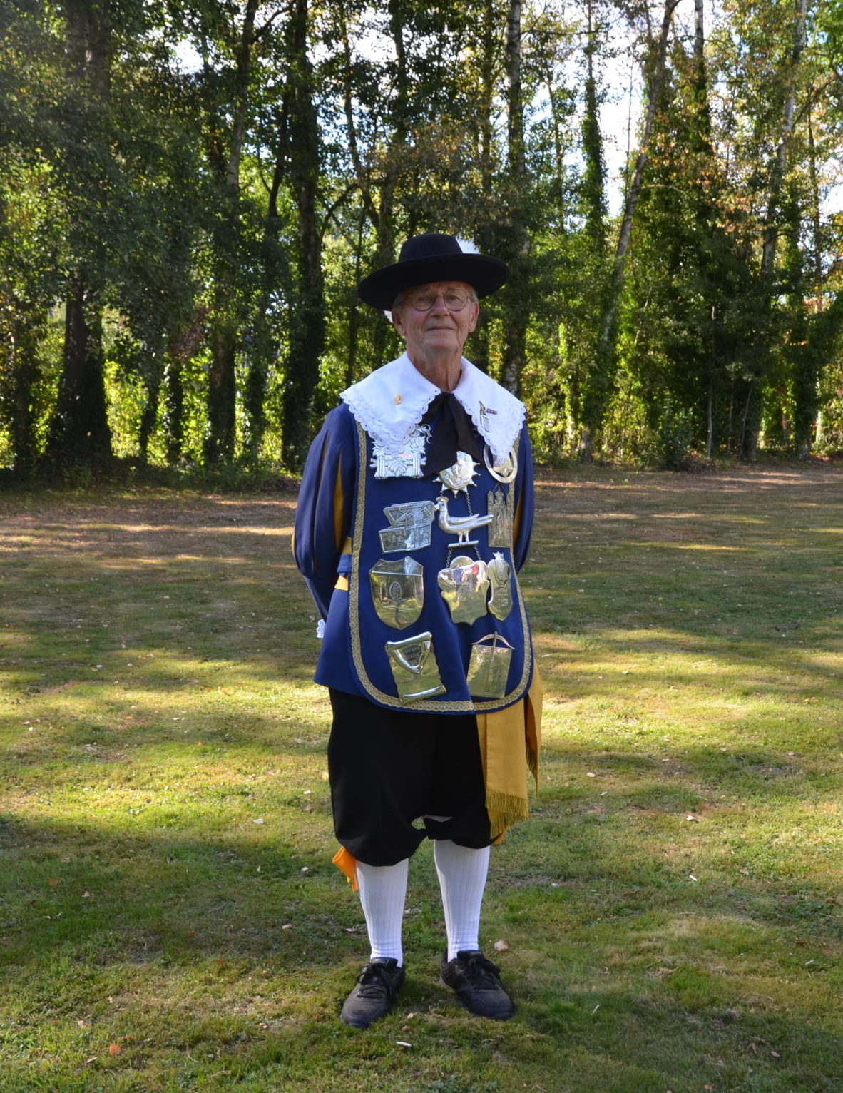 De koning draagt het koningszilver met het kostbare patroonsteken en de zilveren vogel en de koningsschilden. De nieuwe koning dient de zilverschat te verzwaren met een nieuw koningsschild. Op de foto onze huidige koning; Ad Aarts.